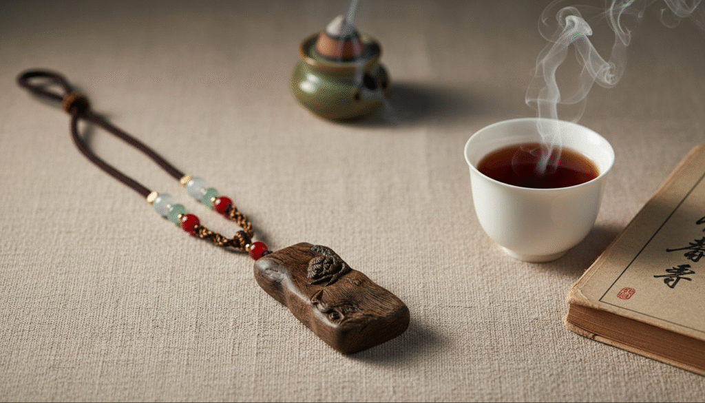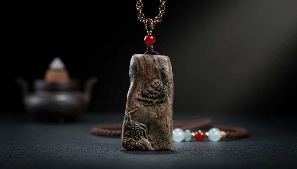 Look closely at the pine scales; they aren’t just mechanically chiseled but ‘guided’ out following the natural resin lines of the agarwood, looking ancient and vigorous. The posture of the crane looking back utilizes a natural indentation in the wood, creating a profound 3D effect. ‘Pine and Crane’ is a simple phrase, but in the marrow of Chinese culture, it represents the most subtle and deepest love for parents and elders. Wearing it is not just an aesthetic choice, but a literal ‘talisman of peace’ held close to the heart.
