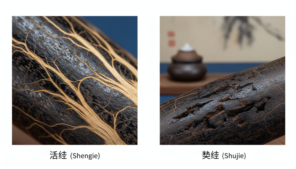 A. This is a core identification point. Under the microscope, the oil of a “Live Knot” (Shengjie) usually appears “smudged” or “flowing” because the oil formed while the tree’s transport system was active, bonding tightly with wood fibers with naturally blurred edges. “Ripe Knots” (Shujie), having undergone tree death and long-term weathering/soil burial, show oil that is “shrunken,” “crystalline,” or “granular,” and wood fibers may show signs of carbonization or decay. For beginners, Live Knot textures are usually clearer and glossier.