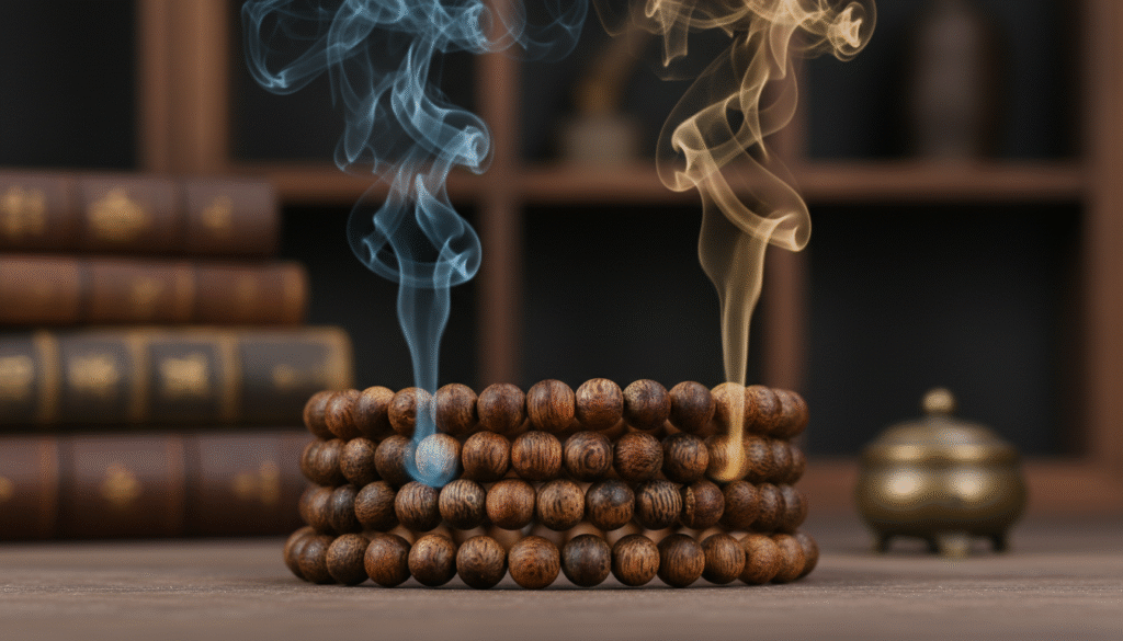 If texture is the skin, scent is the soul. Chinese Agarwood is precious because of its ‘righteousness.’ Upon first smelling these beads, you won’t encounter an intense floral scent designed to please the nose; instead, a rich, pure Traditional Chinese Medicine (TCM) aroma greets you. It is neither sharp nor dry, instantly settling chaotic thoughts. It’s a sense of peace similar to old book pages or an aged pharmacy—what we call the ‘bone of National Fragrance.’ But the magic follows: after wearing it and letting body heat warm it, that medicinal scent transforms into a delicate, lingering sweetness, accompanied by a piercing coolness that reaches the throat, much like the aftertaste of aged herbal tea in midsummer. This is vastly different from the fishy or overly milky scents of some Southeast Asian regions. This layered and long-lasting diffusion is not just the gold standard for identifying high-quality Chinese material, but also the reason it is crowned ‘Head of All Fragrances’ in Chinese culture.