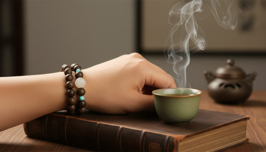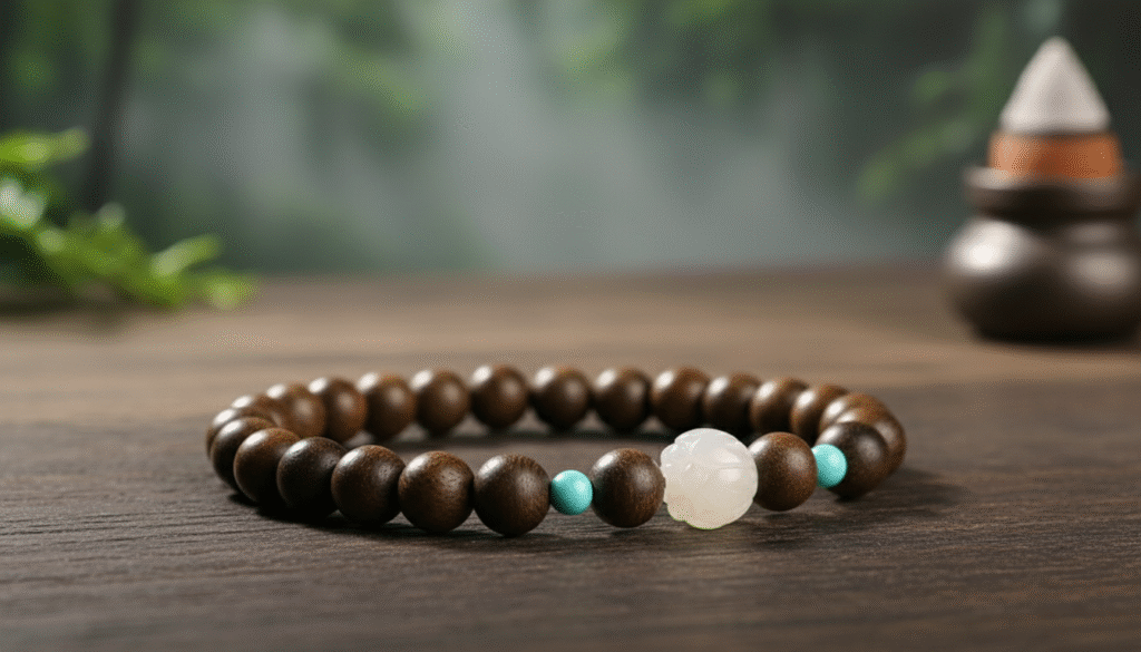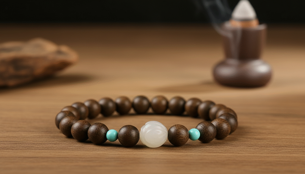 A.That is a very professional question! Hetian jade (hardness 6-6.5) is indeed much harder than agarwood. To solve this, we used a ‘flexible partition’ technique: small turquoise spacers and imported cowhide pads are placed between the jade lotus and the agarwood beads. This not only adds a pop of color but also creates a physical ‘shock absorber.’ You can wear and play with it daily without worrying about the hard jade damaging the precious agarwood!