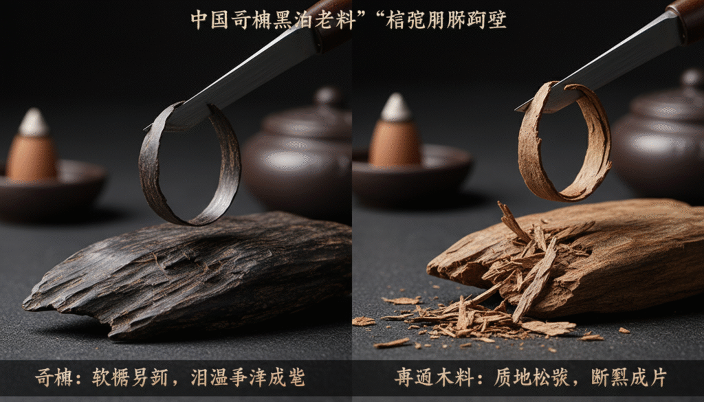 Since we are discussing high agarwood prices, I must teach you some defensive skills. This is experience paid for with high tuition fees, shared for free today to upgrade your authentication level: 1. Shaving Test (Blade Feel): Ordinary agarwood breaks into fragments when shaved, but true Kynam, due to its high oil content and waxy nature, will produce curled shavings (like pencil shavings), and the cut will feel sticky, much like cutting cheese. 2. Taste Test (Mouthfeel): Take a tiny fragment and chew it. True Kynam will first taste bitter, followed by a strong spicy and numbing sensation on the tongue and oral cavity, accompanied by salivation. This numbness can last a long time, proving the resin’s activity. 3. Room Temperature Test (Scent): This is the simplest “demon-reflecting mirror.” Ordinary agarwood has almost no scent at room temperature and must be heated. Kynam, however, emits a distinct cool and sweet aroma at room temperature. If someone offers you “Kynam” that has no scent at room temperature, it is likely a fake.