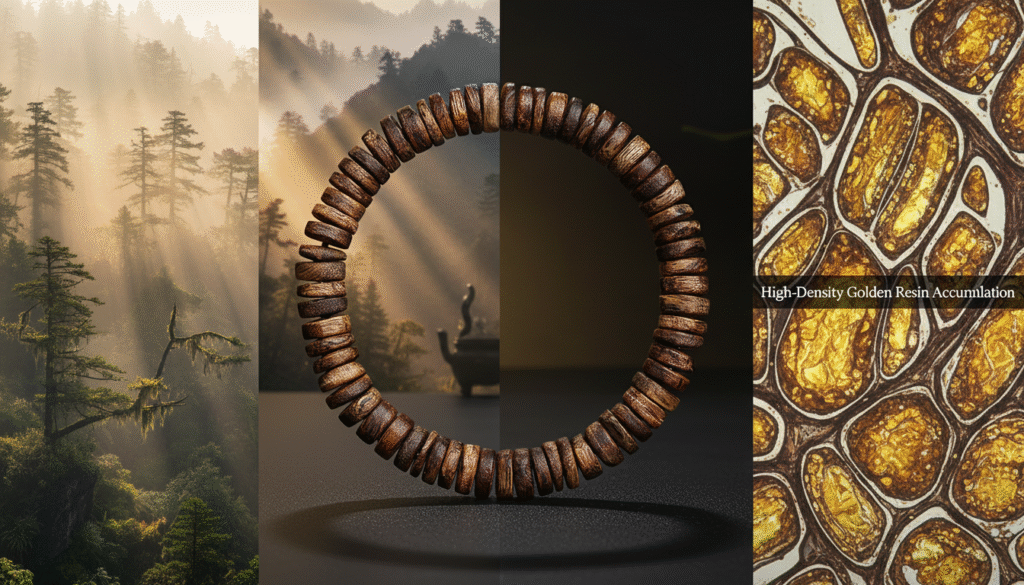 A. The day-night temperature differences at high altitudes and specific fungal environments force the agarwood tree to secrete finer, more active resins to repair injuries. This unique micro-climatic ‘refining’ allows the resin to penetrate deep into the wood fibers (forming Soft Silk), resulting in a highly penetrative scent at room temperature and a honey-like dark amber appearance.