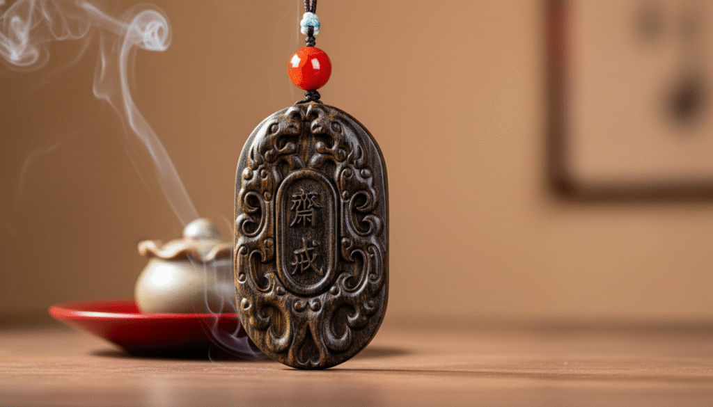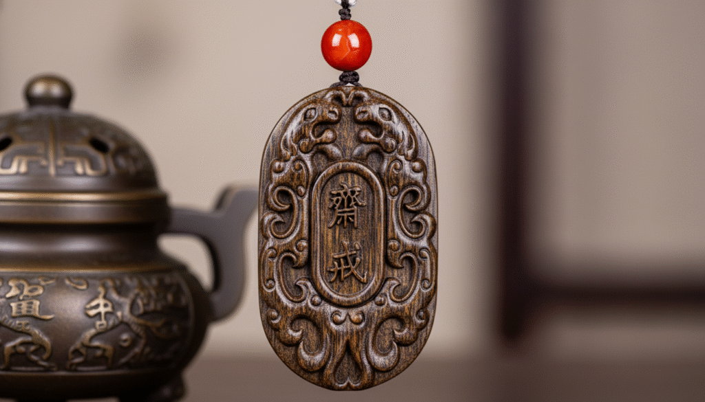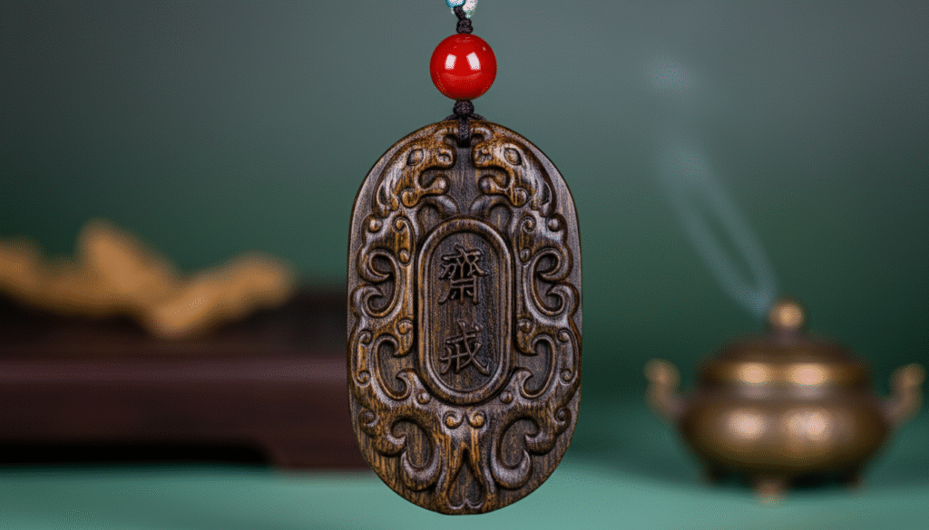 Great material deserves great craftsmanship, but the craft shouldn’t overshadow the wood. This piece features exquisite “Double Dragons Playing with a Pearl” relief. Running your fingers over it, you feel smooth, rounded lines without a hint of harsh tool marks; the dragons’ bodies are powerful, as if churning through a sea of clouds. What captivates me most is the “Zhai Jie” (Fasting/Purification) characters carved in the center. The calligraphy is dignified and elegant, deeply etched, creating a dialogue between minimalism and complexity. “Zhai Jie”, in ancient times, was used to purify the heart before rituals; today, wearing it represents self-discipline and introspection. Furthermore, the red agate bead at the top is a stroke of genius; the clash of red and dark brown instantly adds vitality. Touching it is not just handling an object; it is a silent conversation with an old friend.