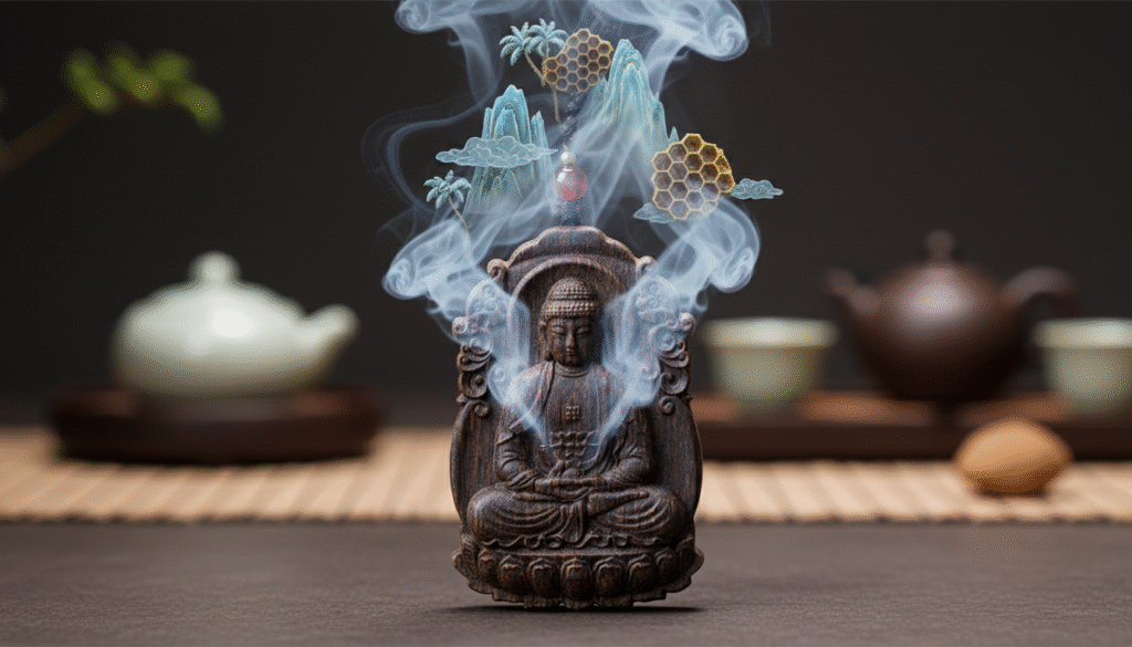 If the Hui-an series is a gentle lady, then this Chinese Kynam, styled after Hainan/Lufeng, is a dominant king. In all honesty, no heating is required; just holding it in your palm for a few seconds releases a highly penetrating ‘coolness’ that shoots straight to the crown of your head. This scent is so familiar—it’s exactly like the crisp air of Wuzhi Mountain in Hainan at 5 AM before the mist has dissipated. This ‘coolness’ is the unique DNA of our domestic Kynam, capable of instantly cutting through the cluttered thoughts in your mind. Then, as the coolness fades, a rich blend of honeyed sweetness and creaminess intertwines, like the first drop of nectar tasted after a long ascetic practice. This ‘coolness first, sweetness later’ layering is remarkably similar to the sword and rope held by Acala—first cutting through troubles, then granting peace. This is why I often recommend Kynam to high-pressure individuals; it truly uses scent to help you ‘re-tune’ your frequency.