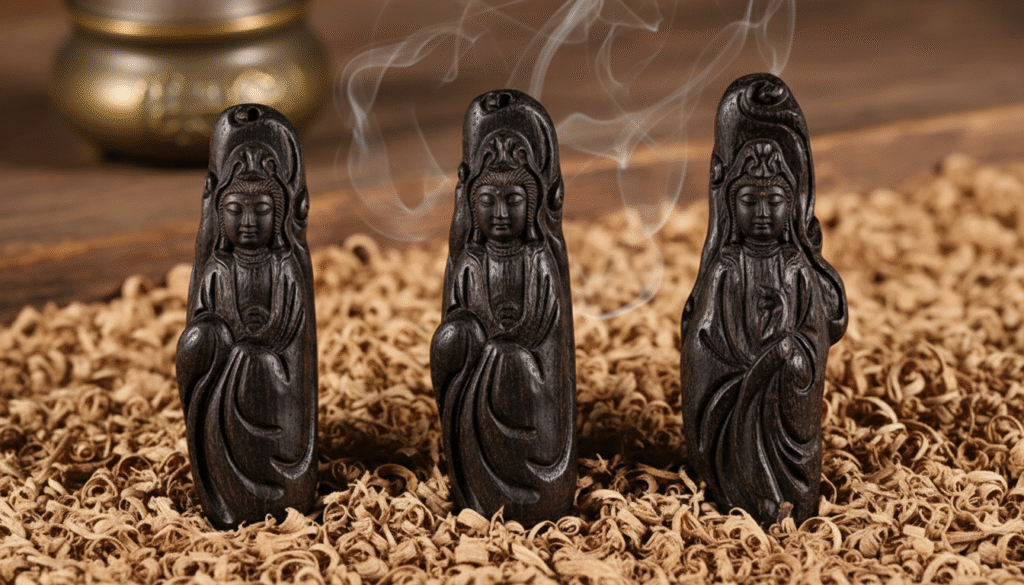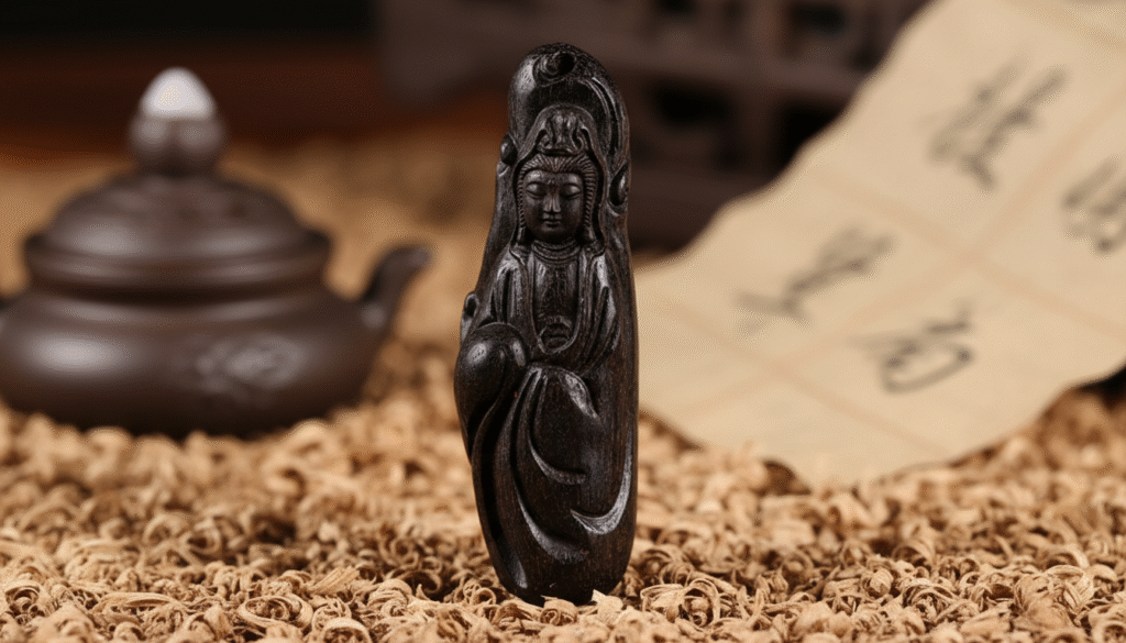 A.This Guanyin pendant is a classic ‘Submerging Grade’ old material. In the Chinese grading system, the resin content must be high enough that density exceeds water (>1.0g/cm³). ‘Black Oil’ signifies not just color, but that resin has completely filled the wood vessels. The moment you hold it, the heavy, sinking weight shatters your perception of wood—it is a true collector’s hard currency.