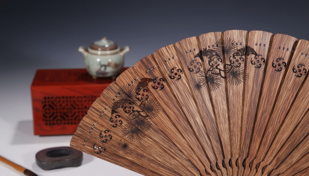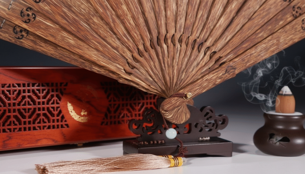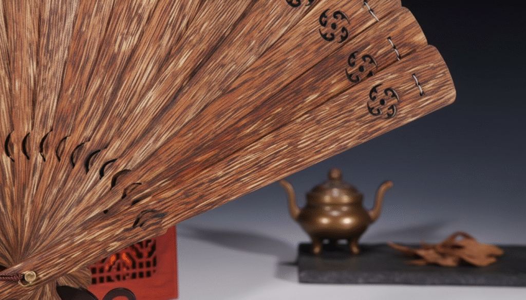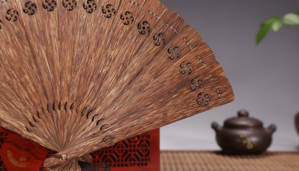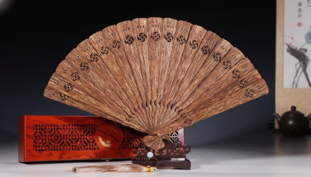 I have been in the Agarwood export business for twenty years and have handled tons of material, but in the gatherings of top collectors, I always say: ‘Burning a piece means losing it; collecting it means eternalizing it.’ The full Agarwood fan is the piece that stirs contradictory feelings in me; I love its supreme elegance, yet I fear wasting its precious raw materials! Do you know how much fine raw Agarwood is consumed to make a single fan? We often have to cut through vast amounts of old Kalimantan wood just to select those few thin slices that match perfectly in grain and color. Today, I don’t want to talk about boring industrial figures; instead, I will take you on a tour to explore this piece that I refused to sell and deposited in my vault. It is not just wood; it is frozen time and a living embodiment of the concept of ‘cool breeze and fragrant aroma.’