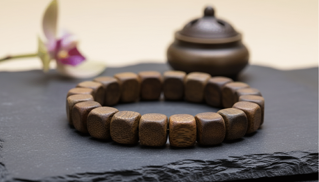 Holding this bracelet, the first thing you feel is a long-lost sense of ‘character.’ In an era where being smooth and worldly is the norm, this unique ‘Sugar Cube’ cut is a breath of fresh air. It draws from the Zen concept that ‘the universe exists within an inch,’ preserving geometric hardness while applying an incredibly soft ‘baby-skin’ chamfer to every edge. An architect friend who visited last week remarked: ‘These beads are like our ideal middle age—edges on the outside to stand firm, but rounded on the inside to treat others with grace.’ This design is not just modern minimalism; it’s a tactile luxury. For urban elites and couples seeking a unique lifestyle aesthetic, this de-religionized, art-forward design transforms ancient Agarwood into a high-tier statement of non-conformity.