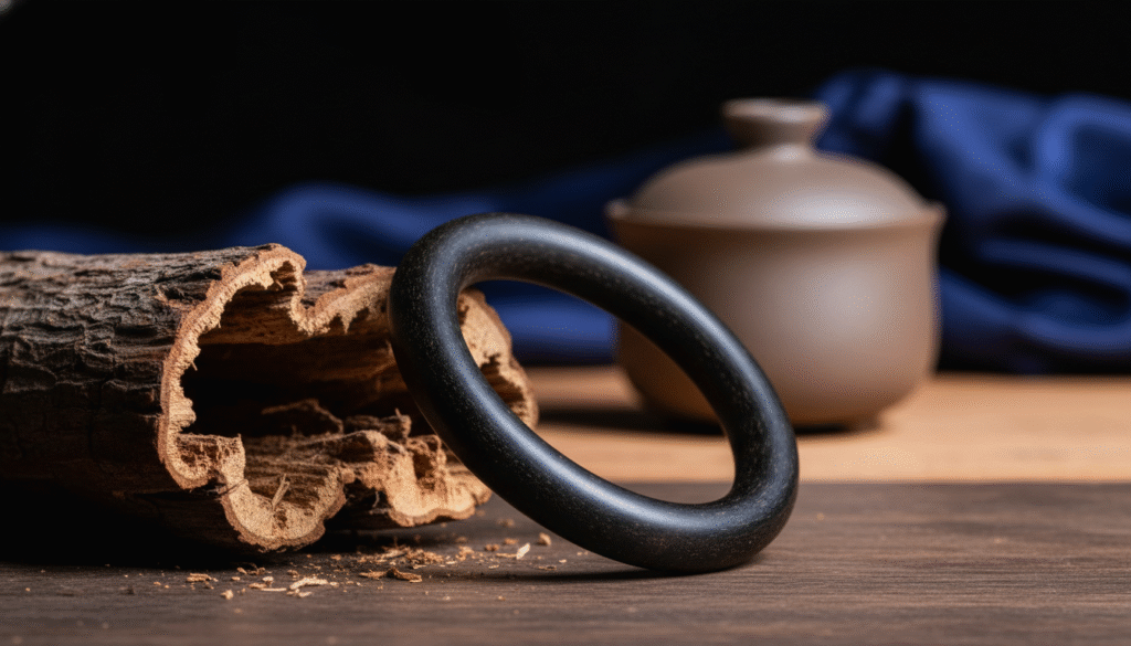 New players often ask why I emphasize “Chinese Kinam.” This starts with history. Since the Tang and Song dynasties, “Tu Chen” (Earth Agarwood) produced in the Guangdong, Guangxi, and Hainan regions of China has been the first choice for tribute. Unlike the continuous humid heat of Southeast Asian rainforests, Chinese production areas have four distinct seasons, which causes the resin to contract more tightly and the mellowing process to be longer. Look closely at this bangle (see image below): the color is deep and jet black, which is a typical feature of high-resin ancient material. This “black oil” is not a surface shine, but a steady depth oozing from within after decades or centuries of high fiber resinification. Even if I do not speak, you can feel the weight of time—a historical product of specific latitudes and microclimates, a “ripe formation” texture that new or artificial materials can never replicate.