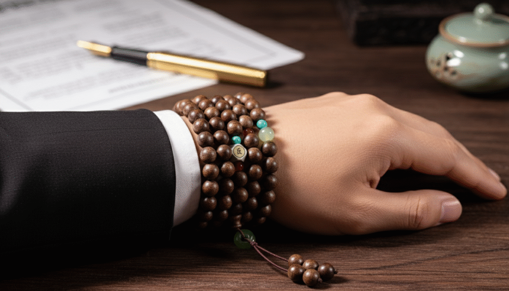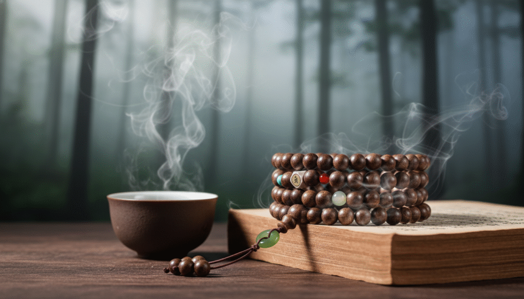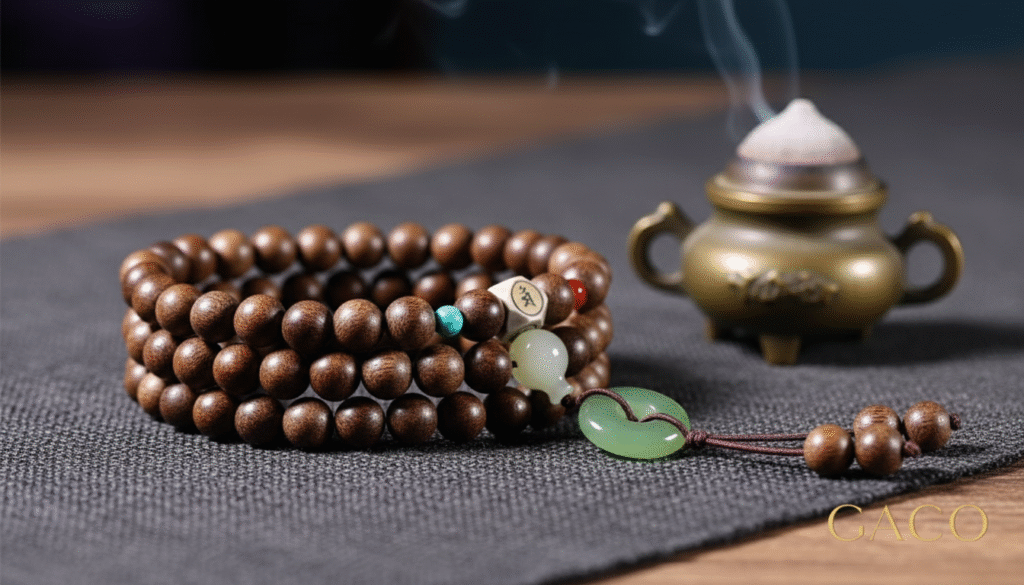 A. Beyond being worn wrapped multiple times around the wrist, a 108-bead long strand is often used as a car hanging for safety or worn as a necklace, which pairs perfectly with tea ceremony attire or Chinese-style clothing. During Zen practice, sitting, or meditation, it serves as a standard counting tool. Particularly with this bracelet’s unique Lingnan Kynam rhyme, it helps to focus the mind and aid in entering a state of stillness through its scent during breathing.