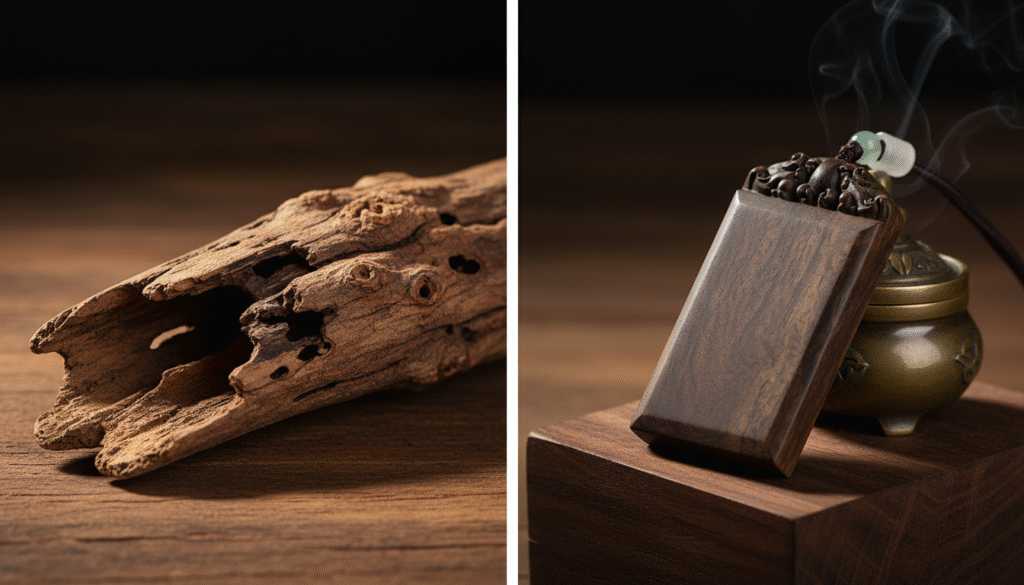 Behind every piece of top-tier agarwood lies an untold legend of the trade. This ‘Wu Shi Pai’ (Plain Pendant) you see wasn’t a simple find from a market counter; it’s a witness to a ‘life-risking’ scent-hunting journey to Nha Trang three years ago. I remember in a remote village in Khanh Hoa Province, I spent three whole days negotiating with an old local farmer named ‘Ah Fu’ for this palm-sized material. The heat was unbearable and mosquitoes were everywhere, but when he tremblingly unwrapped layers of oilcloth from an iron box under his bed to reveal a dark, iron-like piece of old-growth wood, I knew the trip was worth it. This isn’t just wood; it’s nature’s sole gift to those who persist in the dangerous rainforest. Today, as an insider, I want to talk to you about the secrets behind this piece.