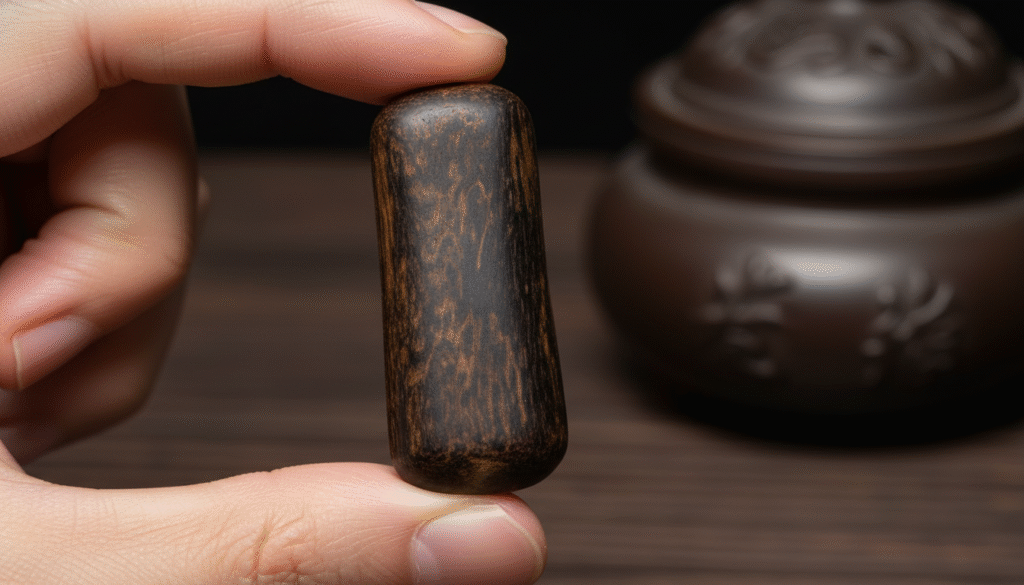 Photos can be edited, but the touch of your fingertips cannot lie. Frankly, having seen countless fragrances, my heart still skipped a beat the moment I held this piece. When you close your eyes and touch this Chinese Kinam, you will be surprised to find it lacks the dryness of wood. Instead, it feels as if your fingers are touching a piece of solidified resin—delicate, warm, and even slightly ‘sticky.’ This is the legendary ‘soft silk’ oil resin. Under a microscope, the oils aren’t just filling the vessels; they have completely softened the wood fibers, forming a ‘wood-oil symbiosis’ colloid. This texture is the result of decades or even centuries of fermentation by time and fungi in the microscopic world. Rubbing it for a long time leaves a fragrance on your fingertips; that moist sensation is like holding a piece of warm black jade that you simply cannot put down.