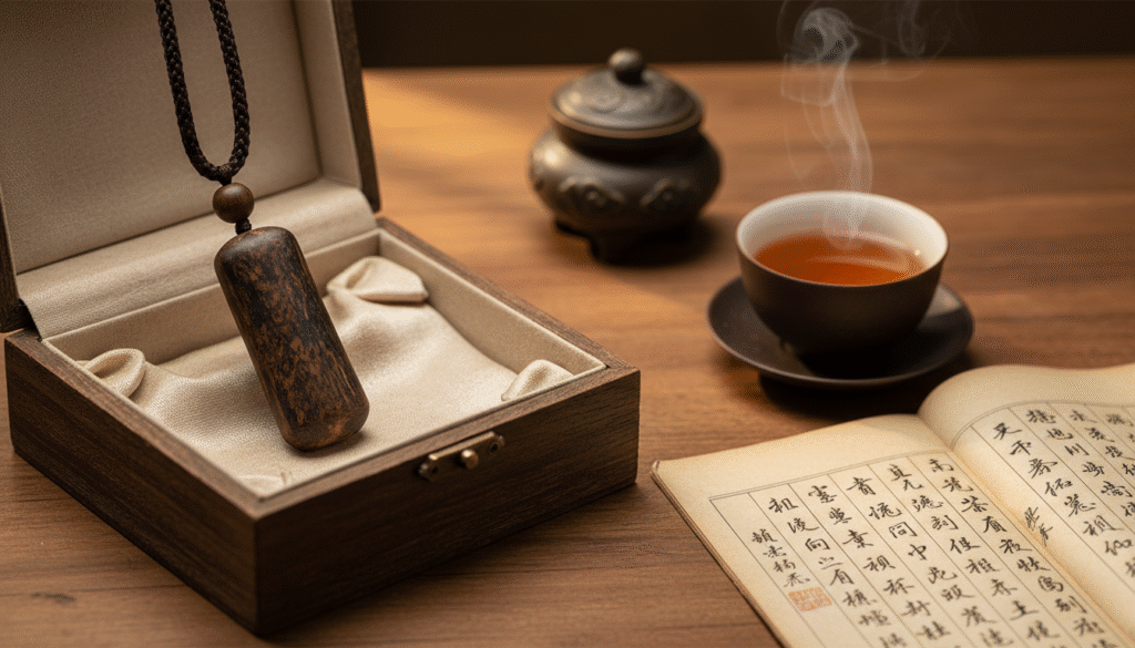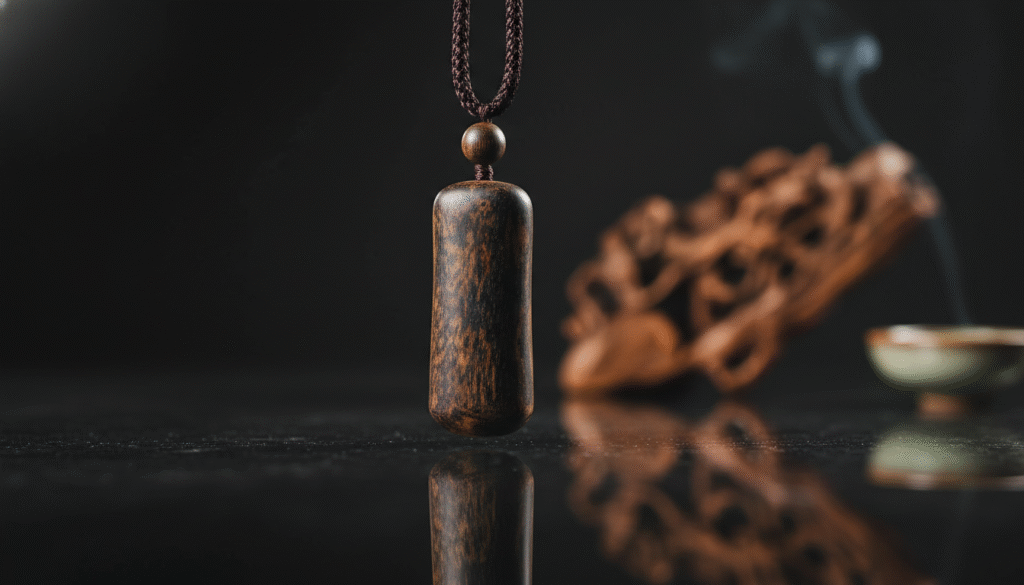 I remember a few years ago at an old fragrance friend’s home in Huidong; heavy rain poured outside while tea smoke curled within. My friend tremblingly pulled a piece of withered wood resembling black iron from the depths of his safe—a century-old Chinese Kinam raw material. At that time, everyone in the industry advised him: ‘Carve a Guanyin, it’s safer.’ After all, nine out of ten old logs are hollow; once cut, if there are flaws, hundreds of thousands of dollars vanish instantly. But he looked at me, gritted his teeth, and said: ‘With meat quality of this level, carving is a crime. I’m going to bet on a plain Wushi.’ As the shrill friction of the cutting machine filled the air, time seemed to freeze. The moment the slice fell, the room went silent, followed by a burst of amazement—full meat, black oil, not a single flaw! The 52mm high, 19mm wide Wushi pendant you see today is the king born from that heart-stopping gamble. It is not just a piece of agarwood; it is a legend of courage and luck.