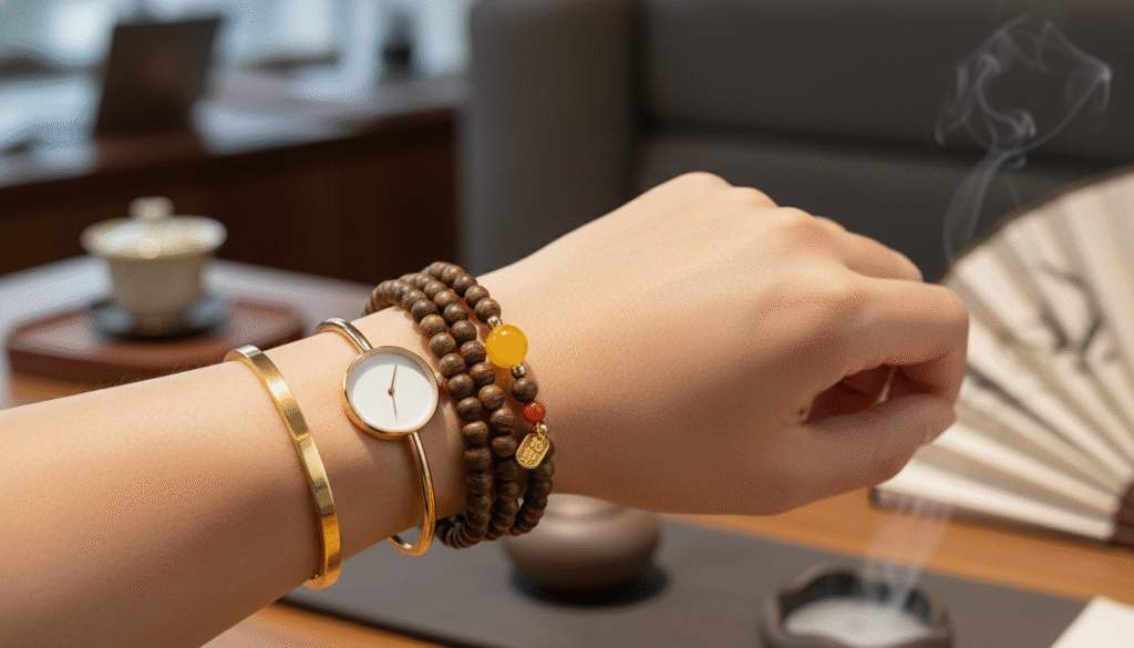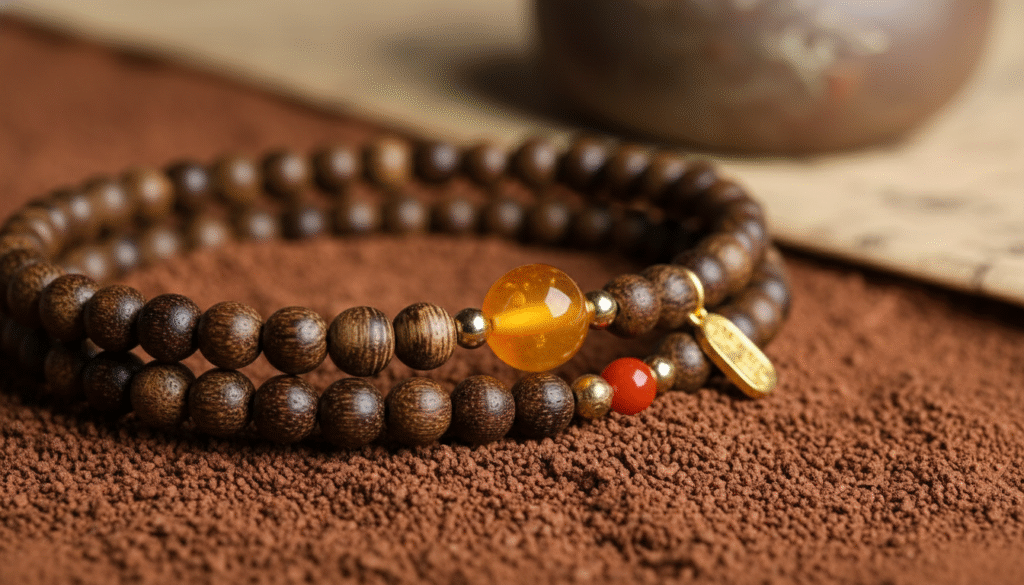 To neutralize the ‘femininity’ and ‘primitiveness’ inherent in agarwood buried in red soil, I introduced a gold pendant symbolizing the sun, amber that condenses time, and Southern Red Agate with full color. This isn’t just for aesthetics; it is a balance deeply rooted in the Eastern Five Elements philosophy: Agarwood belongs to Wood, governing growth and kindness; Gold accents belong to Gold, governing decisiveness; Southern Red Agate belongs to Fire, governing passion and etiquette. These three interwoven elements retain the heritage of cultural play while giving the wearer a modern aura of strength and softness combined. Trust me, whether paired with simple cotton and linen tea clothes or a sharp professional suit, it will sway on your wrist with a high-end sense of ‘winning without competing.’
