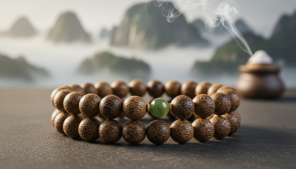 Last night, amidst a gentle drizzle, I unboxed this in my tea room. In twenty years of handling countless agarwood pieces, I thought my heart was a still pond. But when this ‘Chinese Kinam Sinking-Grade Double-Wrap Bracelet’ slipped from its brocade box, its unique, dominant cooling aroma instantly pierced through the room’s aged tea scent, making my heart skip a beat! People often say ‘it must be Nha Trang,’ as if domestic incense is a mere supporting actor. Yet, this piece, with its ink-like black oil and heavy presence in the palm, tells me silently: it is no one’s shadow; it is the ‘Grandmaster’ of Chinese scents. To be honest, this isn’t just a product; it reminds me of what an old harvester deep in the Hainan mountains told me—’True national incense penetrates the bone.’ Today, I’m not selling; I’m guiding you through the market mist to understand our own incense spirit through this black oil Kinam inlaid with Hetian Jade.