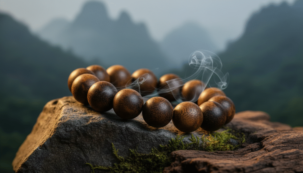 If visuals are the first threshold, then the aromatic charm is the soul of Kynam. Kynam from Chinese origins (especially the core areas of Hainan) is highly esteemed in the international market—even surpassing Southeast Asian origins in the hearts of many collectors—because of its aggressive ‘penetrative power.’ The fragrance of this bracelet perfectly interprets the charm of a high-altitude microclimate. When you smell it closely, the initial note has a strong nose-piercing coolness. This coolness is not the sting of menthol, but a crisp, clearing sensation that shoots straight to the crown of the head, as if standing in the misty depths of the Wuzhi Mountains at dawn. Immediately after, the scent transforms, bursting into rich honey-sweet and floral-fruity notes. This is a unique flavor brought by the symbiosis of Hainan’s unique vegetation and the incense trees—sweet but not cloying, exuding nobility! Most captivating is its base note, featuring signature milky and medicinal-honey undertones. This distinct layering and long-lasting, stable fragrance profile is the watershed between top-tier Kynam and ordinary agarwood. During incense appreciation or meditation, this scent can rapidly bring you into a state of tranquility; it is a true ‘soul-nurturing’ object.