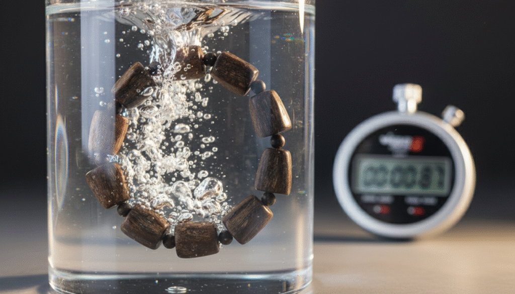 Data does not lie. In the world of agarwood, “sinking grade” is the hard metric for resin saturation and the dividing line between a casual hobbyist and a serious collector. We performed a standard sinking test on this bracelet: the moment the beads touched the water, there was no hesitation or floating; they broke the surface tension and plummeted straight to the bottom. This is not just a victory of physical density (density > 1g/cm³), but ironclad proof of centuries of resin formation. The heavy “hand-weight” of each bead reminds you that this is wild old material condensed over a hundred years, incomparable to the “floating goods” faked with high-pressure oil injection.