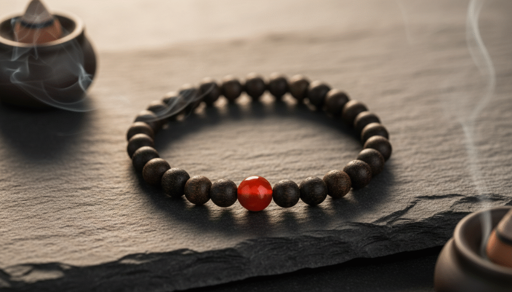 In traditional incense culture, there is an emphasis on “tranquility and restraint,” but if it is purely somber, it lacks vitality. As a finishing touch, I have specially introduced a South Red Agate accent bead into this deep black-brown old-growth string. This is not just for aesthetics; it follows the “Monarch, Minister, Assistant, and Guide” principle of harmony in Oriental aesthetics. Agarwood belongs to water and wood, with an extremely Yin and quiet aura; South Red Agate belongs to fire, symbolizing pure Yang. This splash of red is like a ray of morning sun piercing through the dense canopy of the Kalimantan rainforest, instantly igniting the spirituality of the beads. The round, finely polished South Red Agate contrasts sharply with the rustic nature of the agarwood. It carries both the worldly auspiciousness of “good fortune at the top” and the elegance of “a tiger in the heart sniffing a rose.” This is the true source of a high-end feel.