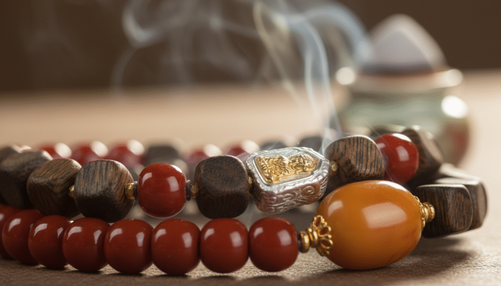 While Kynam is the ‘diamond of the woods,’ it lacks a kingly aura without the support of ‘virtuous ministers.’ In designing this hand-held string, I introduced the Chinese traditional philosophy of ‘Sovereign, Minister, Assistant, and Envoy.’ Agarwood belongs to Wood, governing growth; Southern Red belongs to Fire, governing ritual and music. We specially selected a full-color, full-meat Sichuan Southern Red Agate as a spacer bead. That vibrant red not only breaks the dullness of the dark brown agarwood but also forms a transparent ‘Wood feeds Fire’ pattern in the Five Elements, symbolizing a flourishing life. Then look at the aged Beeswax cylinder; its surface has developed fine ‘weathering cracks,’ the result of decades of natural patina. Beeswax belongs to Earth, carrying all things. Wood, Fire, and Earth converge here, creating both a visual impact of the ultimate Eastern aesthetic of black, red, and yellow, and a perfect energy loop. Every time you play with it, your fingers sliding over the warm beeswax, delicate Southern Red, and soft Kynam, it is a feast for the fingertips.
