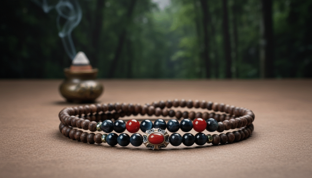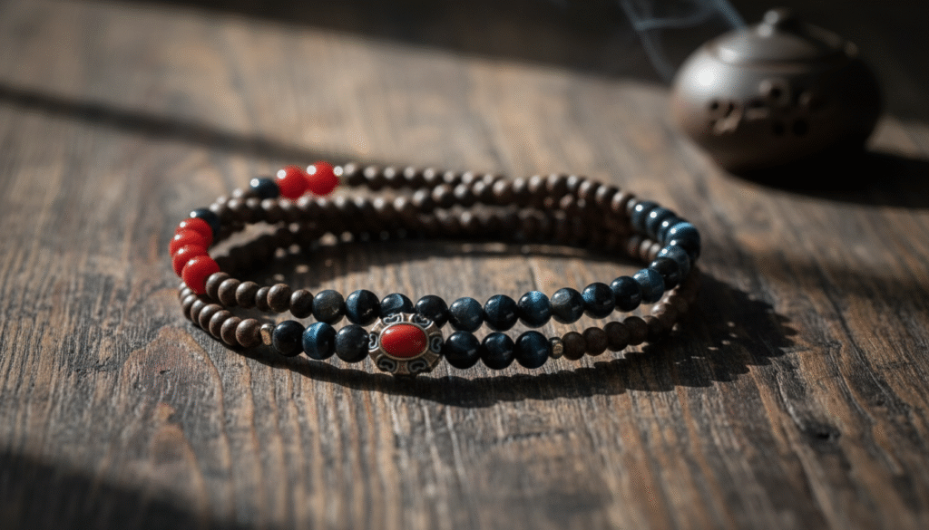Good agarwood needs accessories that ‘understand’ it to wake it up. I don’t see this simply as jewelry; in my eyes, it is a miniature ‘Mandala in the palm.’ We specifically selected Sichuan Southern Red Agate as the top bead, its color as red as a rising sun, symbolizing the passion and vitality of ‘Fire,’ set in 925 silver with a primitive yet noble craftsmanship. The spacers are made of top-tier Blue Tiger’s Eye, deep as the sea, corresponding to the wisdom and calm of ‘Water.’ Water feeds Wood (Agarwood), and Wood feeds Fire (Southern Red). The entire string forms a high-impact red-and-blue contrast in color, while achieving a perfect cycle in Five Elements energy. This design breaks the ‘old-fashioned’ stereotype of traditional agarwood bracelets, allowing it to carry ancient faith while perfectly fitting the aesthetic needs of modern business and elegant gatherings. This is not just aesthetics; it is a blessing for the wearer’s fortune.