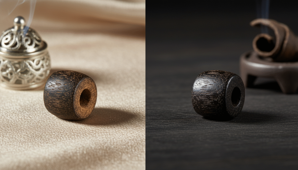 I often get asked, ‘Why not perfectly round beads?’ My answer is always the same: reverence. To grind rare Chinese Kinam into a perfect sphere is to commit violence against nature, wasting nearly 40% of this ‘black gold’ as dust. A true master refuses to do that. The Barrel Cut (Tong Zhu) follows the natural ‘vein’ of the resin flow, preserving the ‘meat’ of the agarwood. It mimics the original segment of the fallen branch. When you wear a barrel bead, you are wearing the conservationist’s choice. You are prioritizing the spirit of the material over the geometry of the market.