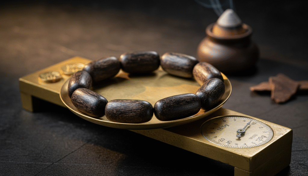 A.In the field of agarwood, weight directly corresponds to density and oil content. For a barrel bead bracelet around 0.8cm, ordinary quality might only weigh 10-12 grams. Reaching 16.5 grams means the oil content is extremely high, reaching the ‘fully sinking’ grade. This represents a resinification period that may have lasted decades or even centuries, serving as the most hard-core indicator of its rarity and future appreciation potential.
