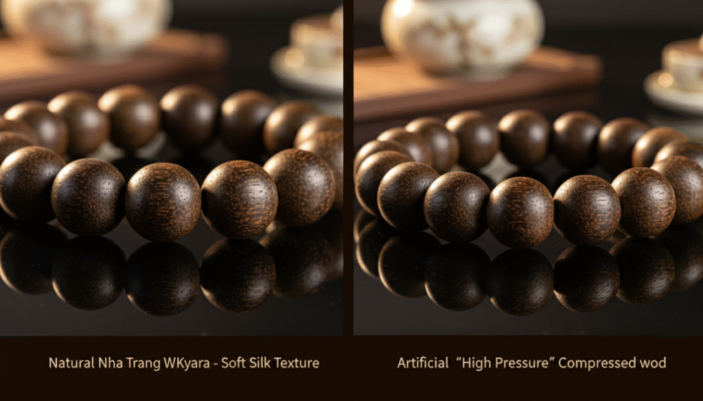After the story, let’s look at the physical attributes. Many novices only look for ‘blackness’ in Agarwood, but with White Kinam, that is a superficial metric. Under a magnifying glass, these 12mm beads reveal a dynamic ‘oil-wood symbiosis’ rather than a dull, dark surface. The signature ‘Soft Silk’ characteristic of White Kinam is fully displayed: the oil glands are not rigidly aligned with the vessels but permeate the wood fibers in patches and clusters, like an ink wash painting. Ancients described this texture as ‘curling when shaved, kneading into a pill,’ as if the oil itself were alive. When held in the hand, the ‘Sinking Grade’ weight instantly conquers your palm. This is not the weight of wood, but the density of high-saturation active resin. In natural light, it emits a faint silvery-white luster—hence the name ‘White Kinam’—stunningly beautiful.