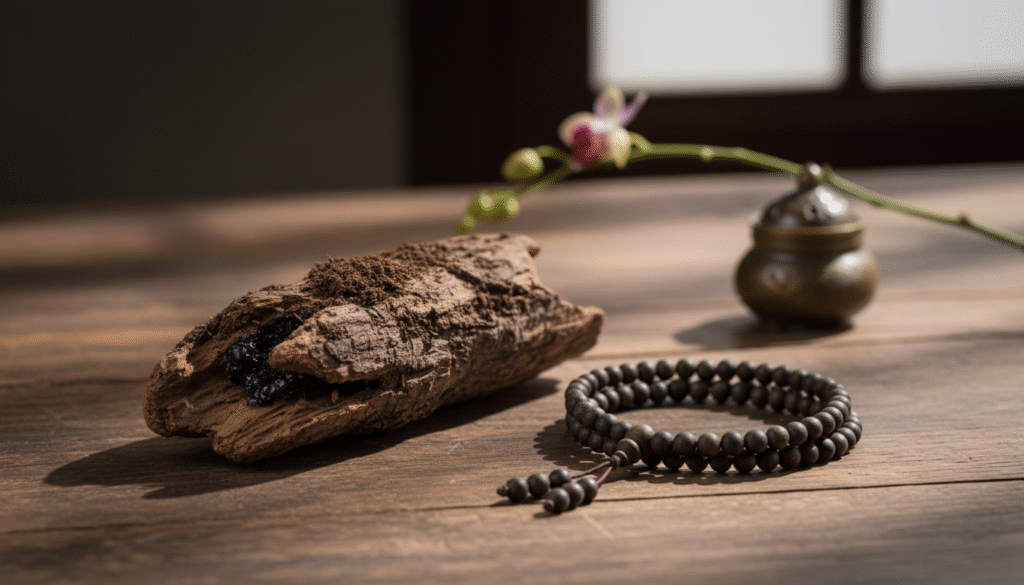Walking the lonely yet long path of Incense Tao for thirty years and having reviewed countless aromatics, I often tell new collectors: “The fragrance finds its destined person.” But when this 108-bead long strand of black oil Kynam from Hainan’s Jianfengling sat quietly on my desk, even I couldn’t help but hold my breath. I know deep down that it is not the person looking for the fragrance, but this spiritual object condensed over a hundred years of time, waiting for a mistress who can truly read its soul. Many on the market claim to be “Kynam,” but those truly worthy of being called the “Soul of National Fragrance” are often encountered but not sought. Today, I won’t talk about dry physical or chemical indicators. I just want to be an old fragrance friend, using this string of beads as a key to lead you through the door of “soft black oil” and “ultimate Zen,” touching a legend of the fragrance lineage that almost faded into history.
