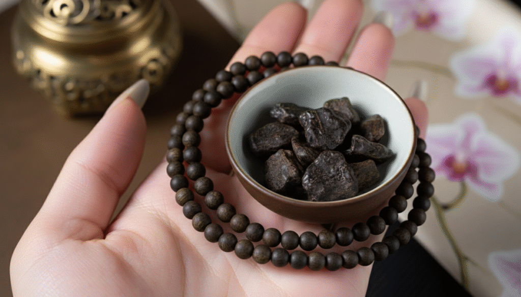 If the black oily appearance is the skin, then the aromatic rhyme is the soul of this Kynam. The reason domestic Kynam stands at the apex of the agarwood pyramid is its overbearing and charming “explosive power.” When worn for a while, body temperature slightly catalyzes the oils, and a highly penetrating “cool rhyme” instantly rushes to the nasal cavity, making one instantly sober like a peppermint chill. Then, the fragrance shifts: rich honey-sweetness and elegant orchid notes intertwine, with distinct layers as if in a secluded valley after rain. Its lingering finish is a long, mellow milky (creamy) scent that persists. This fragrance doesn’t just float in the air; it “drills” into the body. No need to sniff closely; with every movement, that noble national fragrance follows you like a shadow. This is why experts say: “Kynam has no waste; even the scraps are like gold.”
