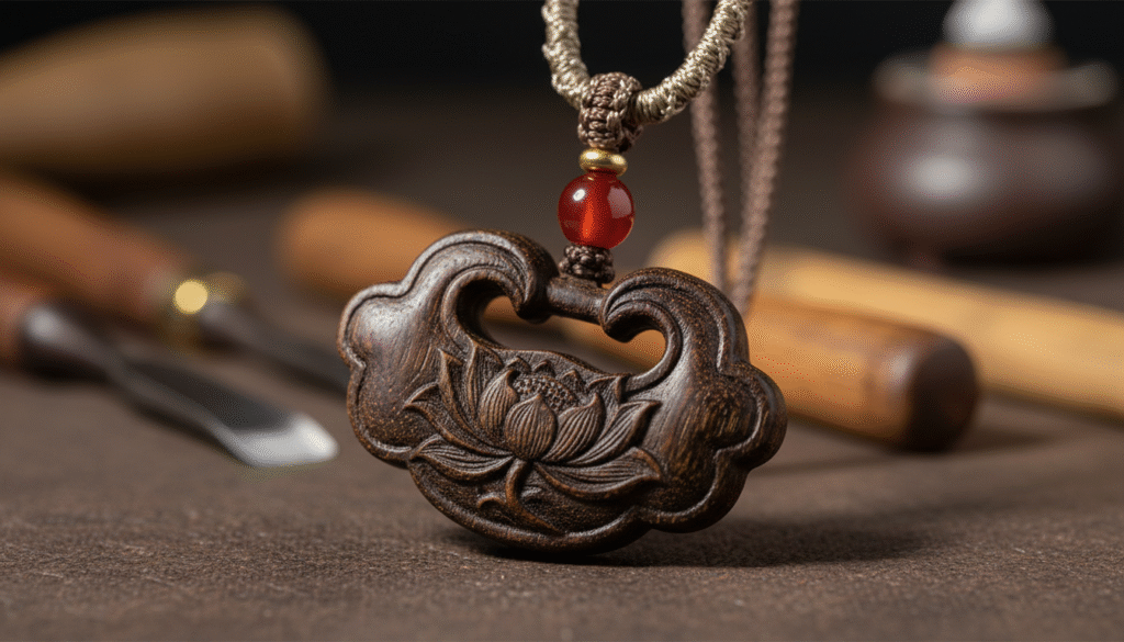 If top-tier material is a gift from nature, then carving is the second life that gives it ‘humanity’. In ancient Chinese culture, a ‘lock’ is meant to keep the most precious things—locking in longevity for children or love for newlyweds. But I define this pendant as a ‘soul lock for modern people’. The master artisan used the sophisticated ‘relief carving’ technique to sculpt a blooming lotus within an inch of space. Look closely at the details: the petal lines are not rigid geometric patterns but mimic the natural curl of a breeze. The lotus symbolizes ‘purity amidst mud’, and the peace lock symbolizes ‘safety through the years’. This is more than a decoration; it is a psychological anchor. No matter how noisy the workplace, smelling this Kinam fragrance and touching the warm wood-carved lotus brings peace to the mind. This is a warmth that machine-produced goods can never replicate.