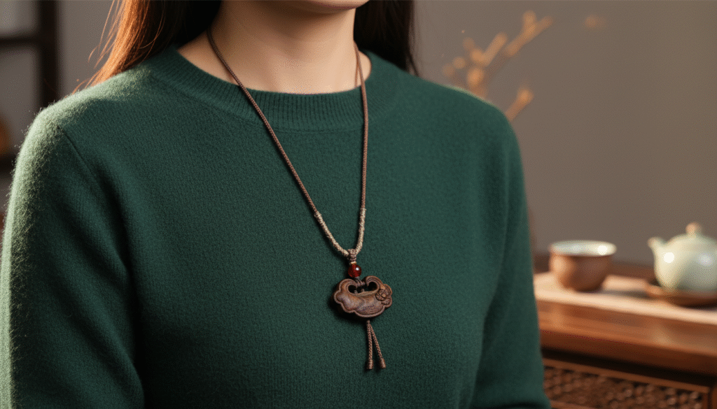 As a veteran collector, I have seen many designs that sacrifice comfort for style. However, this peace lock finds the perfect balance between aesthetics and utility. We specially paired it with a hand-woven brown necklace cord, accented by red cinnabar beads that break the somber tone of the dark agarwood, much like the ‘moss dots’ in ancient paintings that add a touch of vitality. It perfectly captures the current ‘Neo-Chinese’ trend: Pair it with plain linen tea clothes to extend the Zen aesthetic; pair it with modern fashion like a dark cashmere sweater to serve as a warm focal point. Most importantly, the inherent lightness and warmth of wood mean it isn’t cold in winter or stuffy in summer. It doesn’t scream for attention, yet it reveals the wearer’s refined taste in recognizing quality. Expert Tip: Every Kinam oil line is a unique original. If you want to see the oil flow in natural light or discuss how to pair it with your tea outfits, feel free to chat with me directly. Don’t let this ‘authentic’ treasure become someone else’s regret.