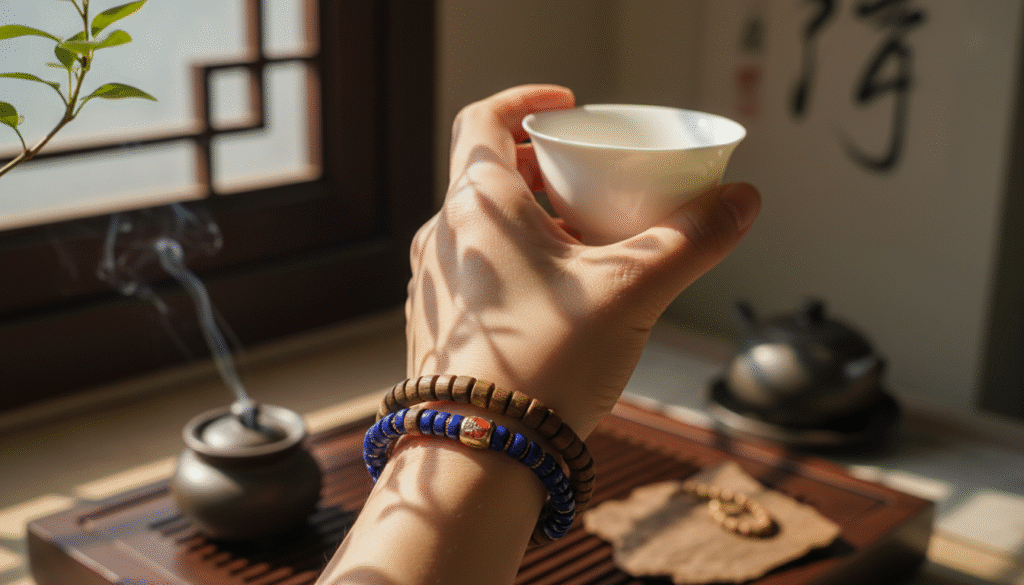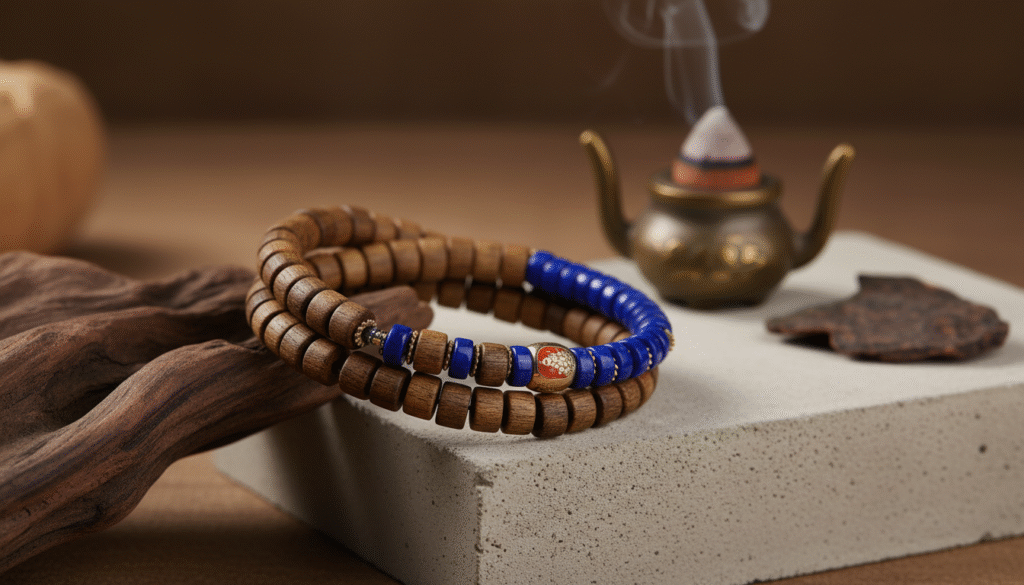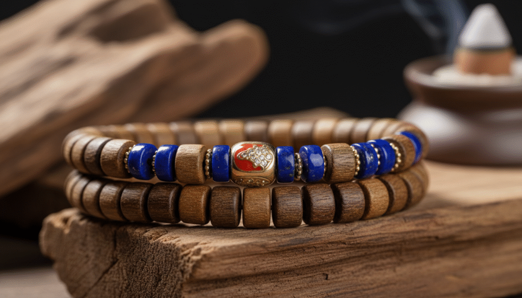 I love the design logic here: the steady brown tones of the Agarwood represent the depth of the Earth, while the vibrant blue of the Lapis Lazuli represents the vastness of the Sky. A 925 silver spacer acts as the transition—its cold glint is like a flash of lightning that instantly ignites the spirit of the entire piece. This ‘Heaven-Earth-Human’ color palette retains the solemnity of tradition while injecting the chicness of jewelry. Wearing it tells the world: I understand traditional roots, but I also possess a rule-breaking modern aesthetic.